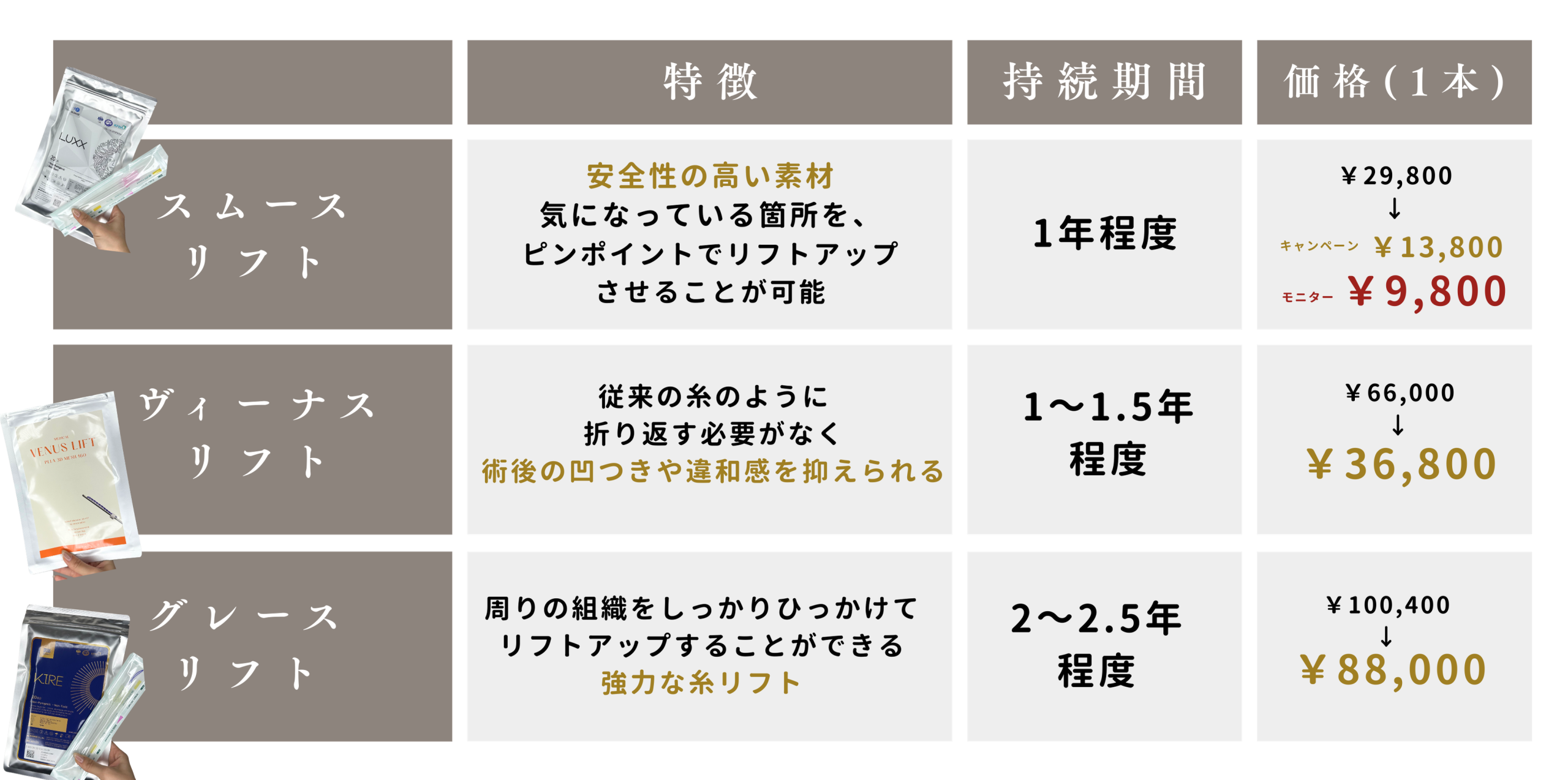 スムースリフト 1本 | 通常価格¥29,800 キャンペーン価格 ¥13,800 モニター価格 ¥9,800 |