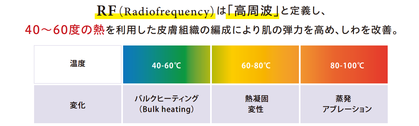 RF(ラジオ波)とは、高周波エネルギーを利用して皮膚の深部に熱を加える治療です。
