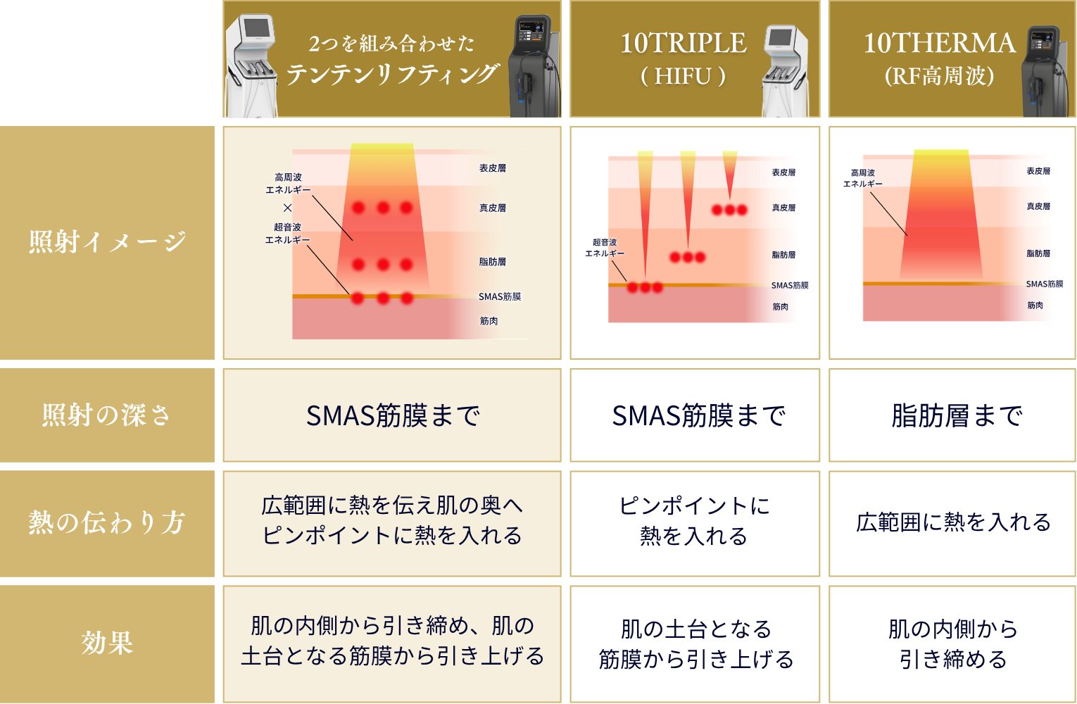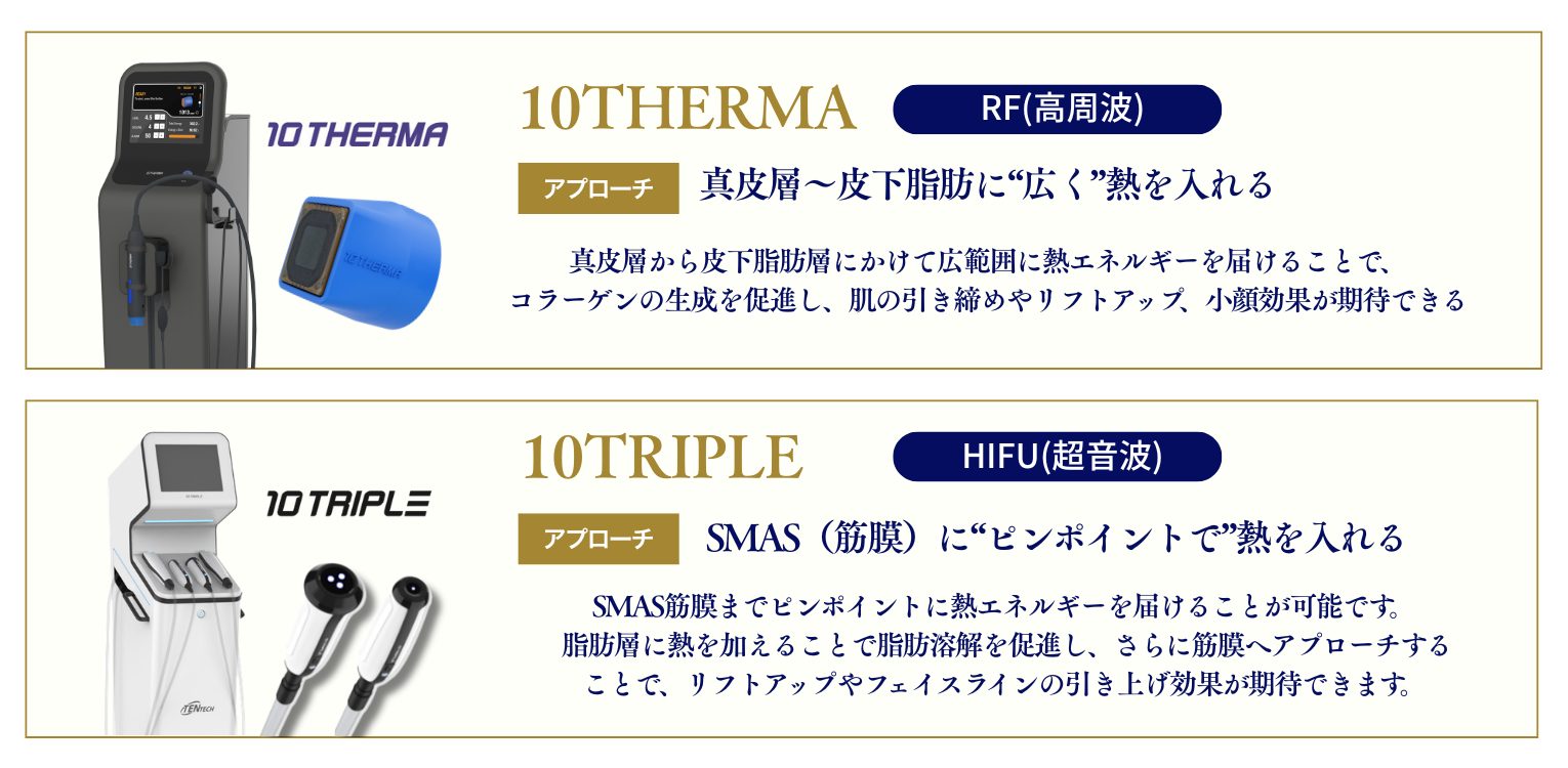 特に、HIFU《10TRIPLE》と併用するテンテンリフティングでは深部(SMAS)と表層〜脂肪層の両方に働きかけることで、より完成度の高いたるみ改善を実現します。