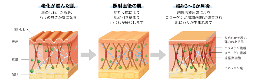 照射直後、熱によってコラーゲン線維が収縮し、たるんだ皮膚がキュッと引き締まります。