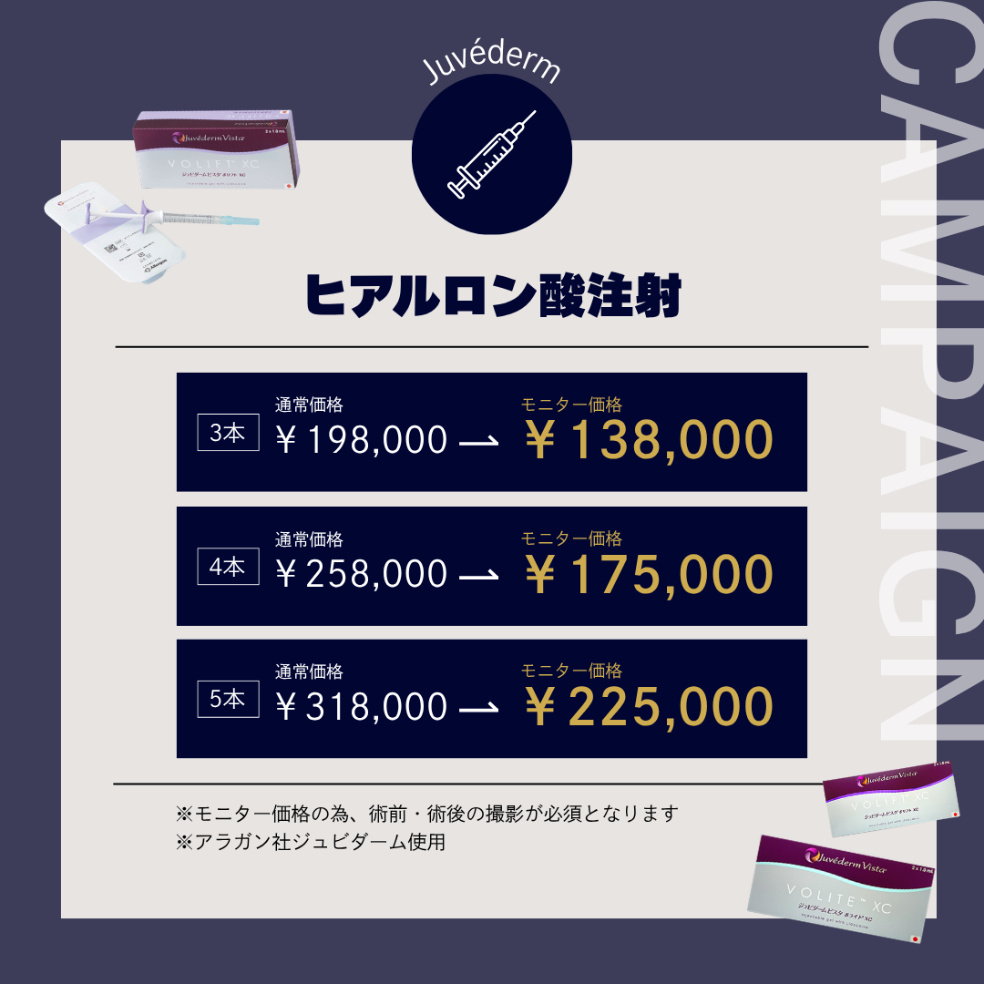 | ヒアルロン酸 長期持続型 | 1本 通常価格¥79,800 キャンペーン価格¥54,800 2本 通常価格¥135,000 キャンペーン価格¥103,000 3本 通常価格¥198,000 キャンペーン価格¥151,000 | |